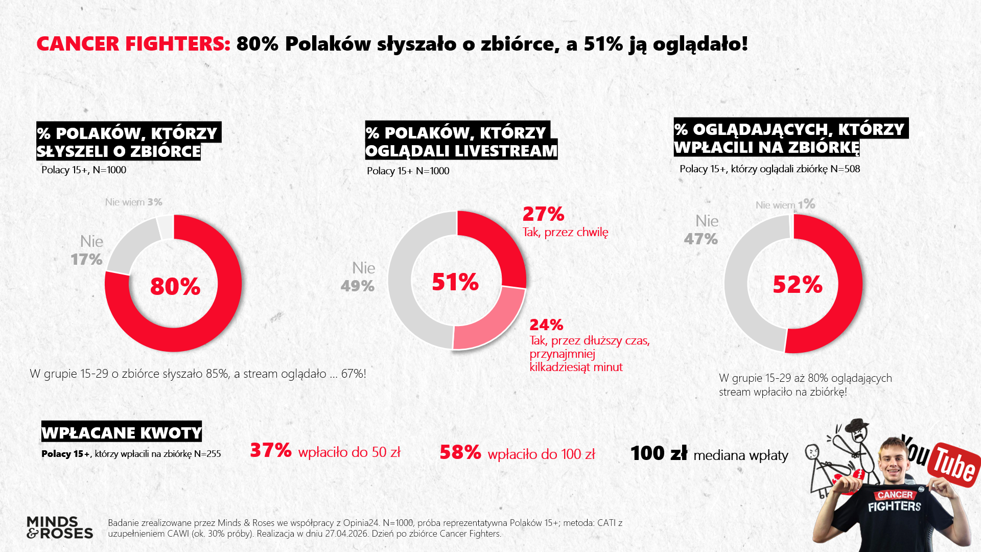 O fenomenie charytatywnego streamingu Łatwoganga usłyszała w ostatnich dniach (prawie) cała Polska. Połowa Polaków oglądała na żywo chociaż przez chwilę. Połowa tych co oglądała wpłaciła na zbiórkę - takie są najważniejsze wnioski z badania zleconego przez Minds & Roses a zrealizowanego 27 kwietnia - dzień po zbiórce.